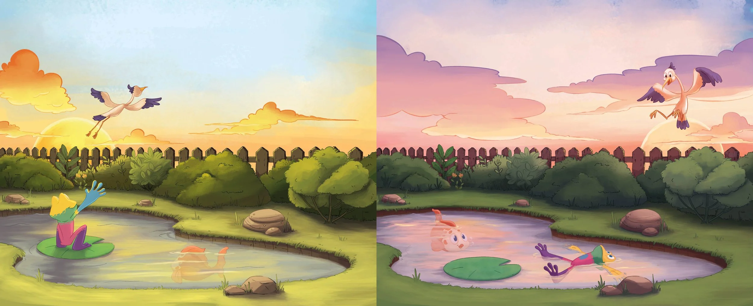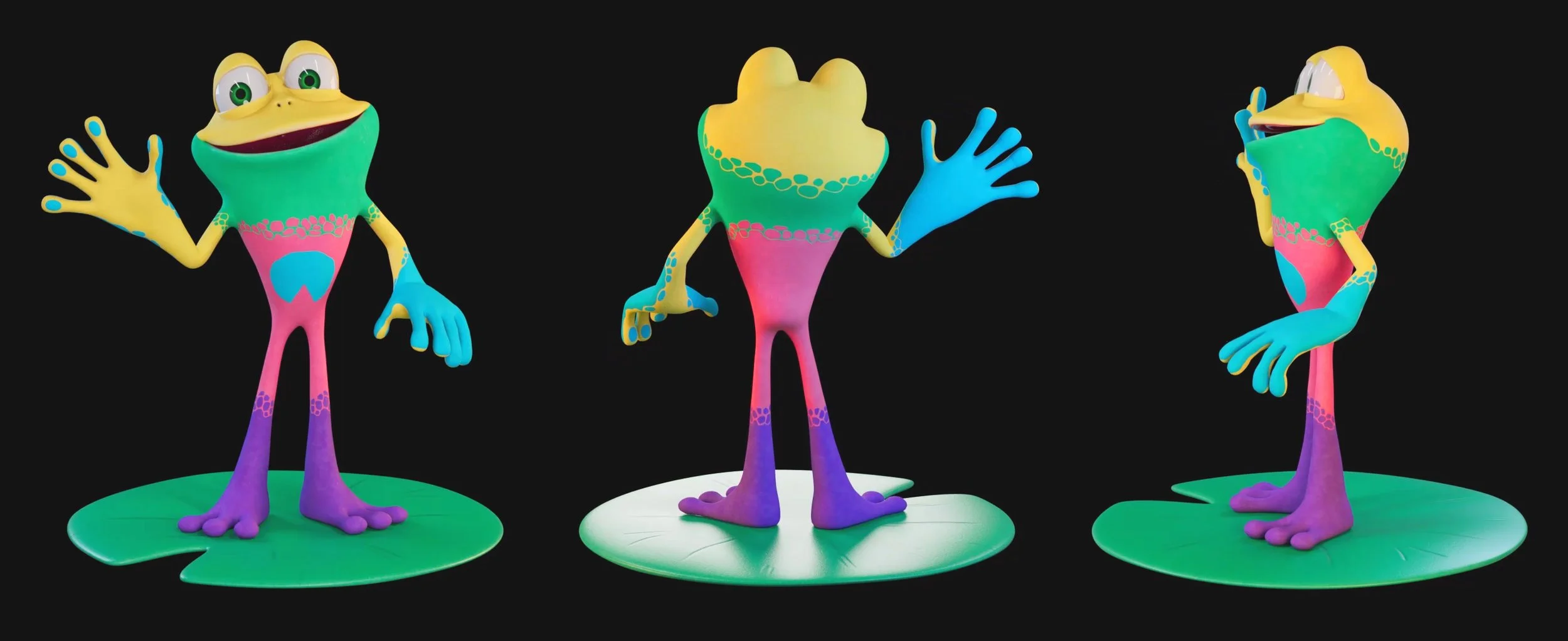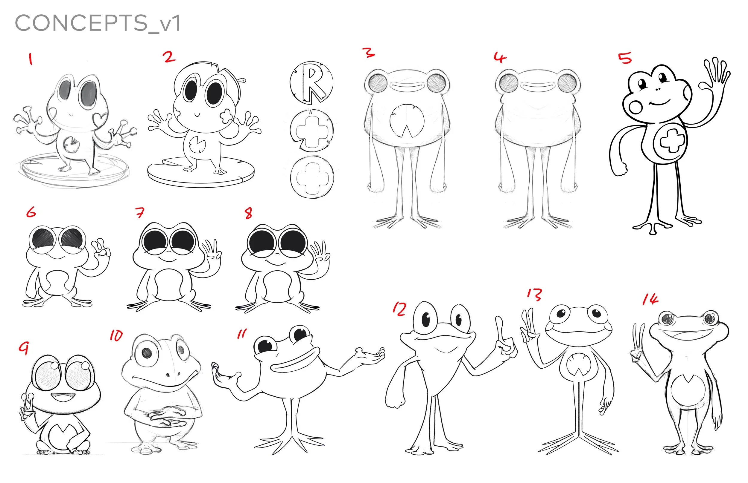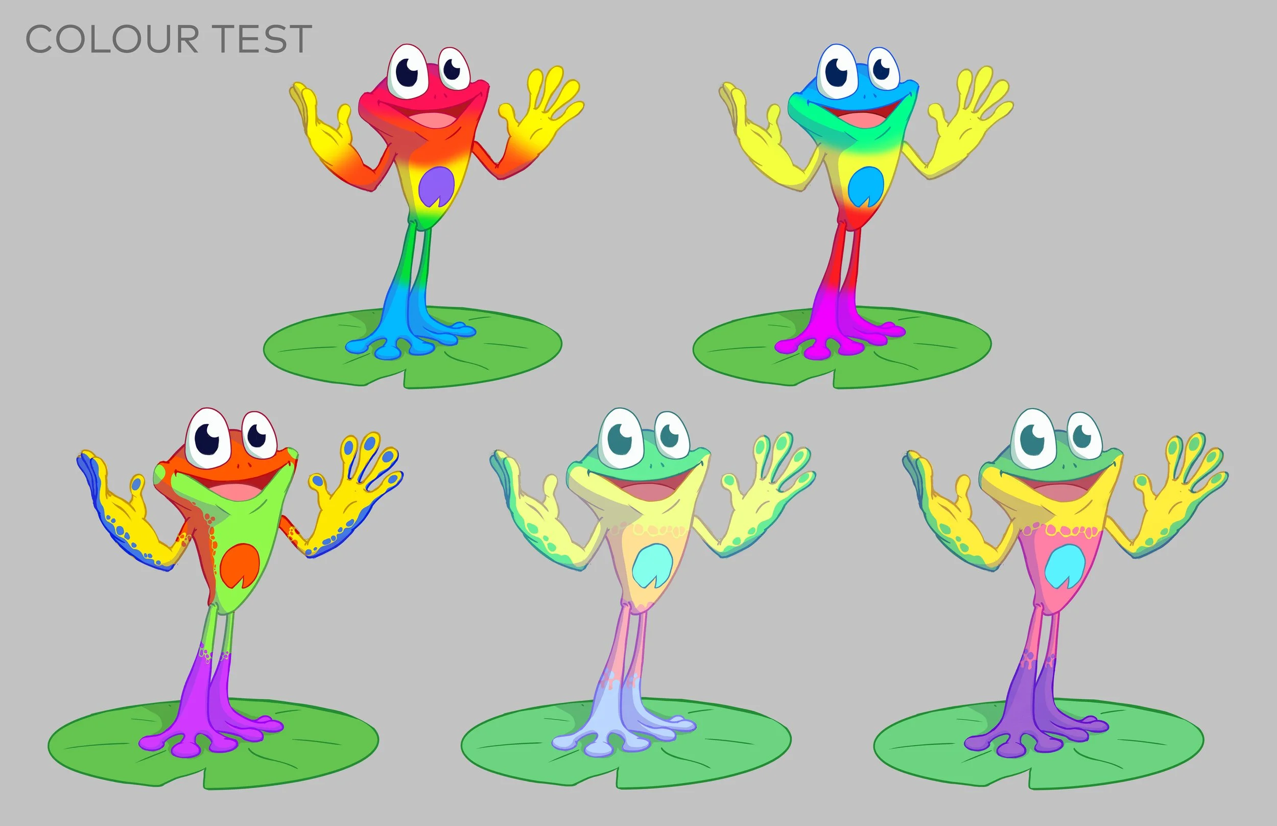 This was a project to design a frog character for a new IP in development. I had a very open brief so explored a lot of different silhouettes and styles to show the client to help them narrow down what would work for them. The final design was turned into a 3D character which I then textured before being animated in a test short.